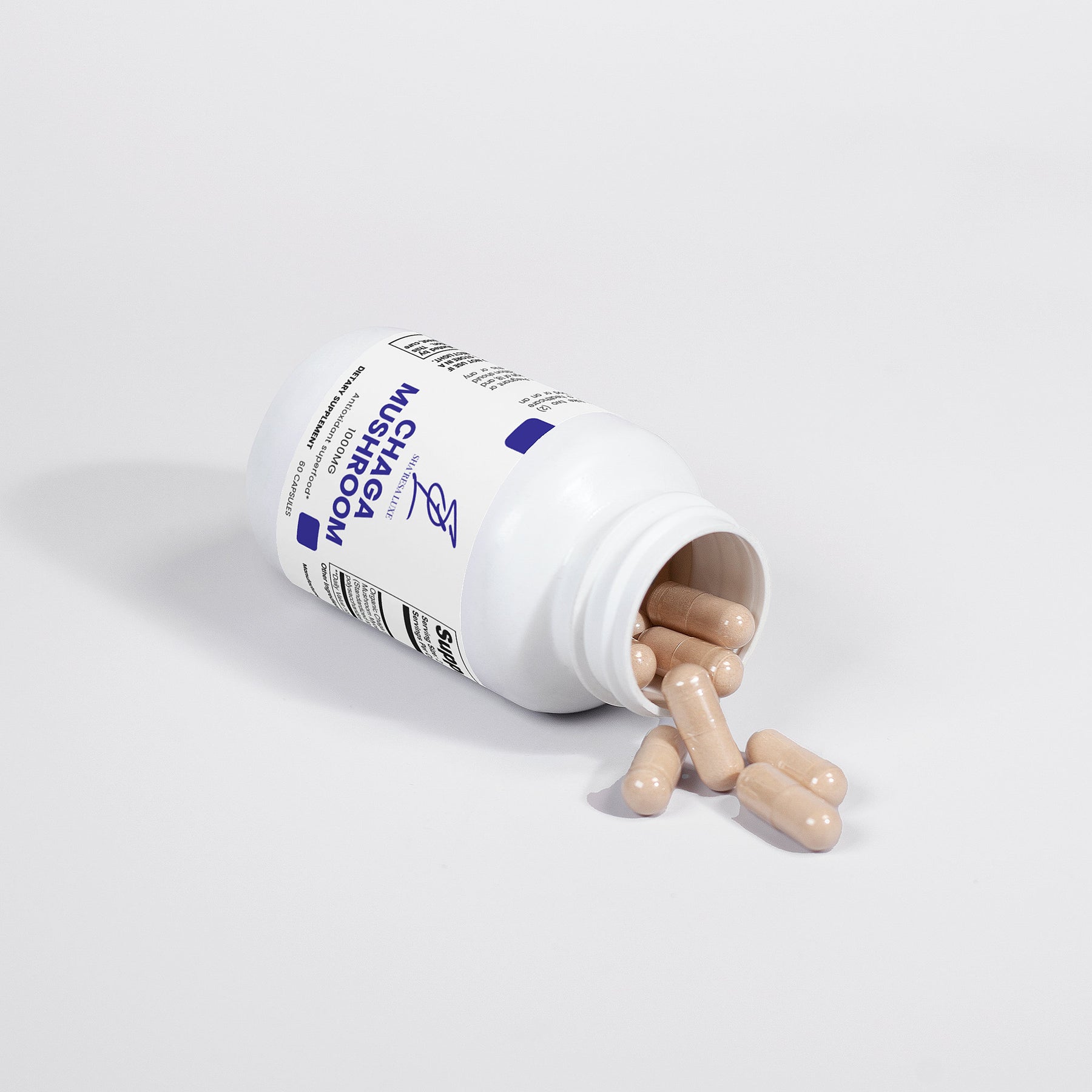 Ingredients: Organic Chaga (Inonotus obliquus) Mushroom Mycelium Powder (Standardized to 40% polysaccharides [400mg]), Organic capsule (pullulan, water), silica.